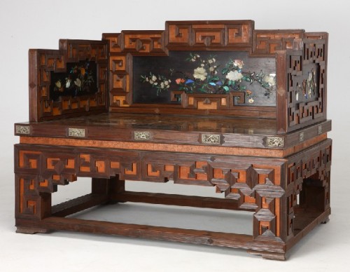 The magnificent throne (shown right) exemplifies the exceptional craftsmanship of artisans engaged by the emperor to furnish his private world. This piece was carved from zitan, a wood so hard and dense that it sinks in water. Techniques including gold painting on lacquer, bamboo thread marquetry, fine wood carving, and jade and hardstone inlay contributed to the elegant solidity of the piece, which likely took well over a year to complete.