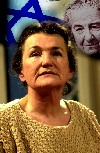 To further accent these shifts of scene and mood the director, Daniel Gidron, has her constantly taking on and off her jacket which is often draped over the back of an office chair. There is another essential prop, a large, generic hand bag. These props, and the ultra baggy costume by Govane Lohbauer, effectively beg the question of how such a frumpy, matronly, housewife, "Mrs. Meir," got to be one of the most powerful women in the world. Not only did she send young people to war, in the ultimate theme of the play, she had her finger on the hair trigger of nuclear arms. This was coded as Temple Bombs in reference to staving off the third destruction of the Temple of Jerusalem.