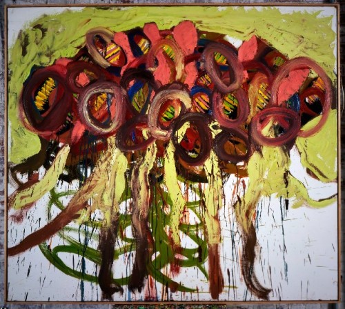 The Neo-Expressionism of the 80’s seemed to be the last gasp of that self-centered version that came out of Germany in the 20’s and 30’s.I wanted a language that would embody the state of things of things as they are. Things as they are swimming in a sea of forces bigger than themselves. But also as inevitably forced into conflict with each other. The titles of the work gave them away: “Mackerel crowded sea “,”Sargasso Sea”, “Footprints”. The first title is taken from Yeats’s “Sailing to Byzantium”, a poem that establishes a sharp contrast between the modern reality of man as swarm and a more god based hierarchy that lends a ground of eternity to our individual existence. “Sargasso Sea” created in my mind a sort of organic island without substance that houses enumerable species….”Footprints” imagines a larger force squashing lesser forces. The latter title and painting is no permission to this sort of oppression but a rather sang-froid description of academic politics. I have always felt that the sadism that we love to imagine is so far from our day-to-day lives virulently in the perverse little politics of the world we work in.