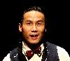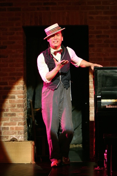 The evening started on a casual upbeat note. There was little or nothing on the "stage" of the intimate theatre with stadium seating. One could see the tiled floor and brick walls in the back with large window-like inserts. There were a few props: A piano on a flat, a large trunk, a standing lamp, and a wall around what would prove to be a drum kit. For several minutes before the 8 pm "curtain" Mr. Wong just appeared and interacted with a turnout of friends. There were hugs and handshakes. He had his pants rolled up revealing thick calved legs and a pair of designer running shoes. After chatting with friends he started to walk up the stairs. I was startled when he was just standing there in front of me. This has never happened before and I didn't know how to react. It is unheard of for actors to literally meet face to face with the audience prior to a performance. He introduced himself and with a handshake I returned the greeting and introduced Astrid. I informed him that I would be reviewing the show. He seemed surprised at the information and said that perhaps we should keep our distance. It was a charming and disarming moment and I found myself determined to enjoy the performance of such an obviously fun and unpretentious actor. He proceeded up the row saying hello to more surprised members of the audience.