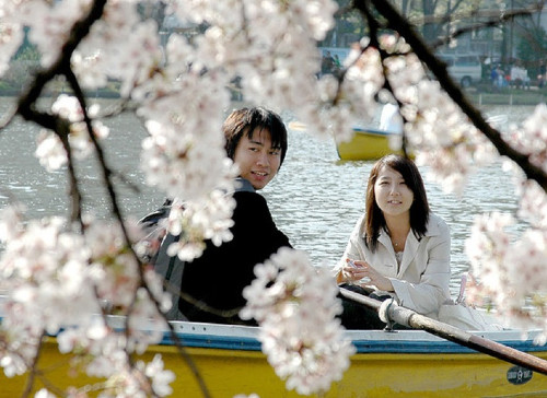 Cherry trees blossom beautifully and briefly and are symbols of the evanescence of life. In Leah Nanako Winkler’s Double Suicide at Ueno Park!, three trees who appear as stilted storytellers float blossoms down from the play’s start. We know that the unfolding lives will also be brief. Hanami, or the viewing of transcient flowers, is best practiced in the park where the play takes place, Ueno.