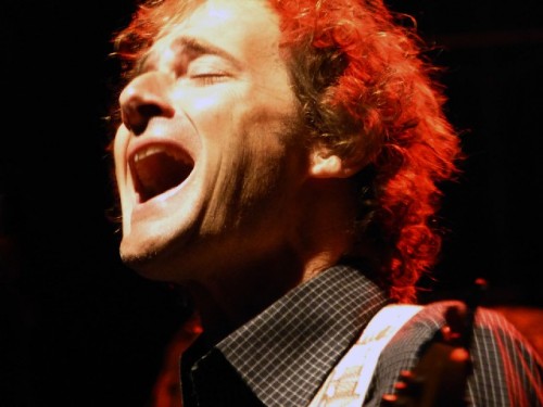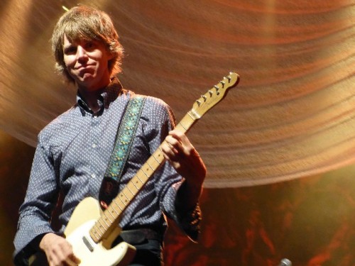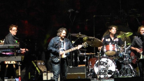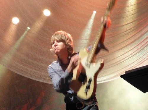 With a crush of other photographers, last night, we were herded into the mosh pit in front of the stage of the Joe Thompson Field to shoot the first three songs by Wilco. It was all sharp elbows in the paint jockeying for the money shots. But some babes with heavy equipment, and sloe eyes for Tweedy and his sidekicks, took just a few snaps. They seemed more intent on being up close and personal with the fab rockers.