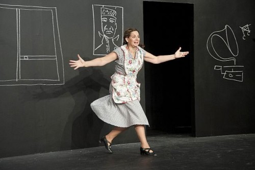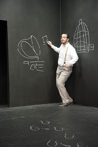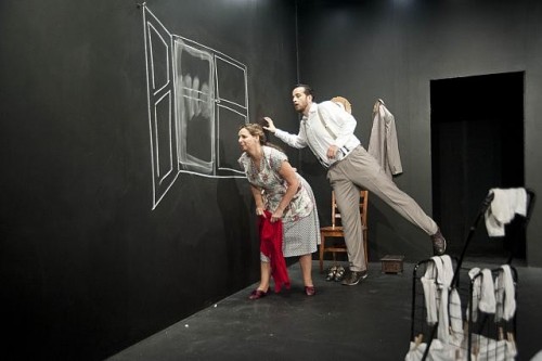 First, however, with chalk she draws the window. It is both clever and plausible. Elements of props are drawn as the drama progresses: A parrot in a cage, hanging lamp that needs to be fixed, a gramophone for some rhumba music, a telephone, shoe shapes on the floor for a dancing lesson.