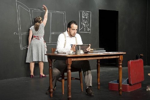 In addition to the chalked up semiotics the actors simulate a range of sound effects from chatter in the hall, ringing door bells and telephones, and the screeching parrot.