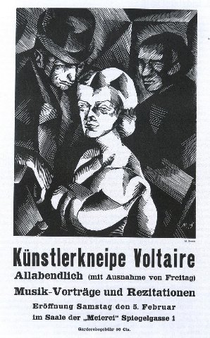 The German poet, Hugo Ball (1886-1927) and his companion, later wife, Emmy Hemmings (1885-1948) were scratching out a living in Switzerland as cabaret performers. They opted to open their own venue, with some 60 seats, as Cabaret Voltaire. In ran from February 1916 through that summer. Often packed and notable for aesthetic anarchy it earned its place in history.