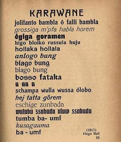It will serve to show how articulated language comes into being. I let the vowels fool around. I let the vowels quite simply occur, as a cat meows … Words emerge, shoulders of words, legs, arms, hands of words. Au, oi, uh. One shouldn’t let too many words out. A line of poetry is a chance to get rid of all the filth that clings to this accursed language, as if put there by stockbrokers’ hands, hands worn smooth by coins. I want the word where it ends and begins. Dada is the heart of words.
