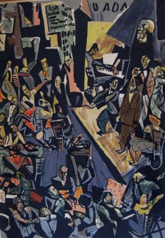 Janco painted a memorable view of a typical night at the cabaret. In 1941 he and his family fled to Israel. Hans Arp wrote a vivid description of the chaos “The people around us are shouting, laughing, and gesticulating. Our replies are sighs of love, volleys of hiccups, poems, moos … Tzara is wiggling his behind like the belly of an Oriental dancer. Janco is playing an invisible violin and bowing and scraping. Madam Hennings, with a Madonna face, is doing the splits. Huelsenbeck is banging away nonstop on the great drum, with Ball accompanying him on the piano pale as a chalky ghost. We were given the honorary title of Nihilists.”