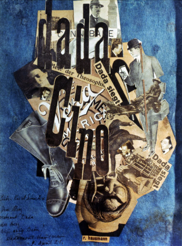 Raoul Hausmann, who helped establish Dada in Berlin, published his manifesto Synthethic Cino of Painting in 1918 where he attacked Expressionism and the art critics who promoted it. Dada is envisioned in contrast to art forms, such as Expressionism, that appeal to viewers’ emotional states: “..the exploitation of so-called echoes of the soul…A child’s discarded doll or a brightly colored rag are more necessary expressions than those of some ass who seeks to immortalize himself in oils in finite parlors.”