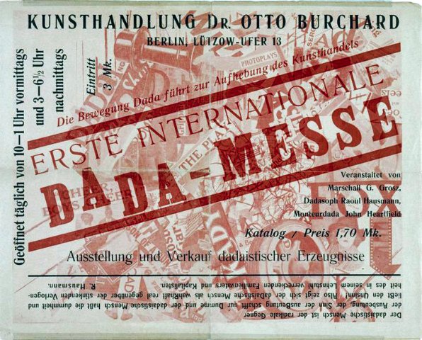 After the war, the Berlin artists published a series of short-lived political magazines and held the First International Dada Fair, ‘the greatest project yet conceived by the Berlin Dadaists’, in the summer of 1920. As well as work by Grosz, Hausmann, Höch, Johannes Baader, Huelsenbeck and Heartfield – the exhibition also included the work of Otto Dix, Francis Picabia, Jean Arp, Max Ernst, Rudolf Schlichter, Johannes Baargeld and others. In all, over 200 works were exhibited, surrounded by incendiary slogans, some of which also ended up written on the walls of the Nazi’s Entartete Kunst exhibition in 1937. The Berlin group published periodicals such as Club Dada, Der Dada, Everyman His Own Football and Dada Almanac