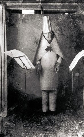 Attired as an avant-garde bishop with cardboard robes and mitre, on stage Ball recited his Dada Manifesto.