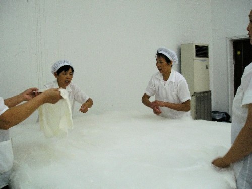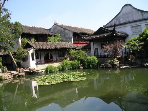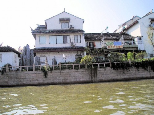 The next day, the 40-minute train ride to Suzhou gave us our first glimpse of the countryside. The two-story train passed by rows of young trees to be later transplanted to city parks, rice paddies, ponds for farming shrimp and freshwater crabs, workers' apartments and many shacks. As we approached Suzhou, the number of run-down buildings with laundry stretched across bamboo poles and of high-rise buildings increased. Suzhou is a 2500-year-old city with a population of 600 000 people, a small town by Chinese standards. Until 1949, because of its gentle climate rich people lived here and built elegant gardens and homes. Many were destroyed during the Cultural Revolution; a select number have been restored and are well maintained now.