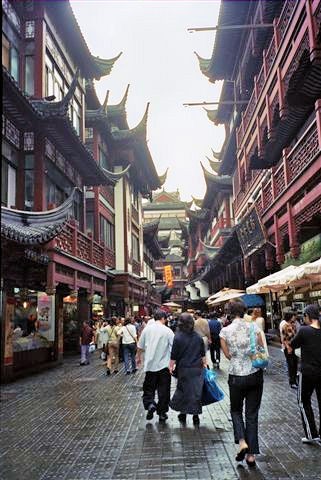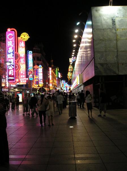 Lunch was a Mongolian barbecue, a buffet of raw meats and vegetables accompanied by a variety of pungent sauces, which we piled on our plates and carried to the cooking station. Stir-fried for us while we waited, this meal was a novelty rather than a culinary experience. Based on the recommendation of two travel-mates who had enjoyed a foot massage the night before, I decided to have one too. Getting to the health club known for this required a stroll down the pedestrian section of Nanjing Road, by now in its evening glory. Computerized light patterns rushed up, down and sideways on building facades. Chic shops glittered with stylish window displays featuring Caucasian mannequins. The pedestrian density was at its peak as people enjoyed a shopping spree after work.