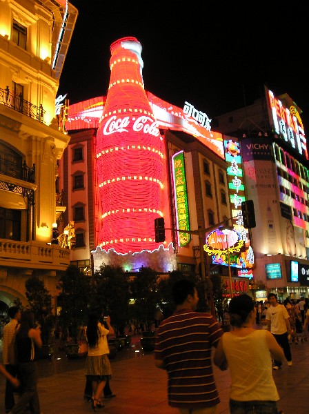As the van approached the hotel on Nanjing Road, the flamboyant skyscrapers glowed in lights, including one that looked like a pineapple. The vertical city seemed to pulsate with stacked up signs and large video screens advertising everything from cosmetics to Pampers. Green Sprite bottles lit from within lined both sides of the street. A gigantic Coke bottle donned in red created a street corner landmark. There was no doubt that in Shanghai communism and capitalism thrived side by side.