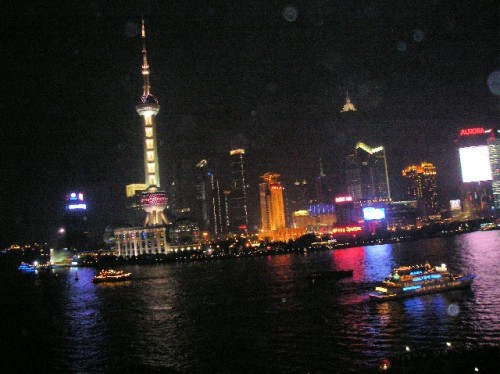 On our final night we went to the trendy Bar Rouge for a drink and to have a bird's-eye view of the city from the rooftop of 18 Bund. The lighting of all the buildings enhanced their architectural detail and played up the uniqueness of each high-rise spire as if they were competing for first prize. Square Chinese characters on advertisements and lit riverboats added a pictorial quality to the nightscape. The light spectacle before us celebrated Shanghai, whose people enjoyed making money and spending it with abandon.
