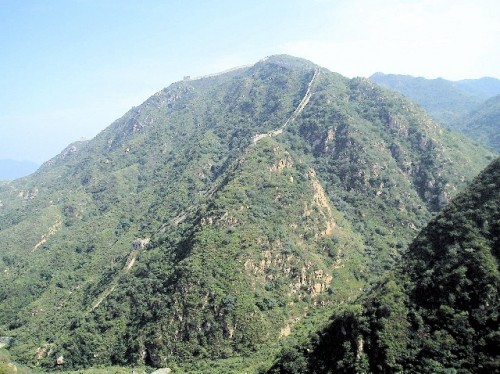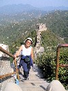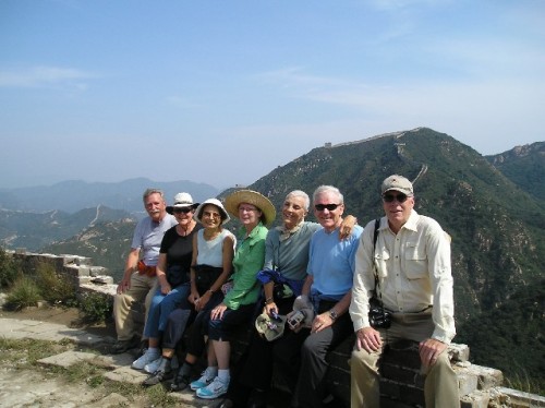 Afterwards, the trip to the Great Wall outside Beijing was most engaging. We traveled to Badaling by bus and transferred to a van at the foot of the mountain. To reach the Wild Great Wall, the unrestored section, where there are no crowds, we went uphill on narrow dirt roads, passing by summer villas, a collision of two trucks, and trees planted to stop sand blowing in from the Gobi Desert. Then we began our climb of about 500 steps, stopping at times to rest and to take in the view. Seven out of our group of sixteen made it to the top, a great photo op with the Wall snaking across the hills around us.