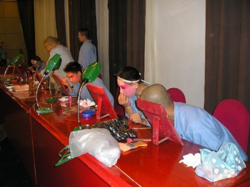 Introduced to us by our guide as one of the three musts in addition to the Great Wall and Peking duck, the Beijing Opera began as cultural entertainment for court society. It combines songs, dialogue, mime, dance and acrobatics accompanied by Chinese instrumental music including a lute called the pipa, and a two-stringed fiddle, the erhu. Folk tales, legends and classical literature inspire the plots, imperial court dress the lavish costumes. The colors and intricate design of the actors' painted faces provide clues as to their character, age, gender, etc. For example, red stands for brave, blue for arrogance. We watched the actors paint their faces before a shortened version for foreign visitors of the opera that lasts up to three hours without applause. I found the faces quite compelling and could not resist buying a T-shirt displaying some of the imagery.