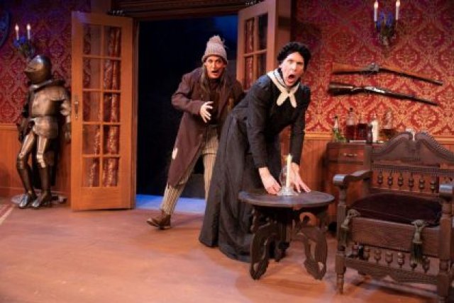 In this way and others, The Mystery of Irma Vep is a love letter to live theater. For instance, the piece includes references to playwrights such as William Shakespeare and Oscar Wilde. Also, one of the characters was a former actress. Speaking of the Bard, his enthusiasts might smile at the several asides during which actors briefly address the audience. By the way, if you are the shy type, you might consider sitting toward the back. The actors interacted with audience members seated closer to the stage.