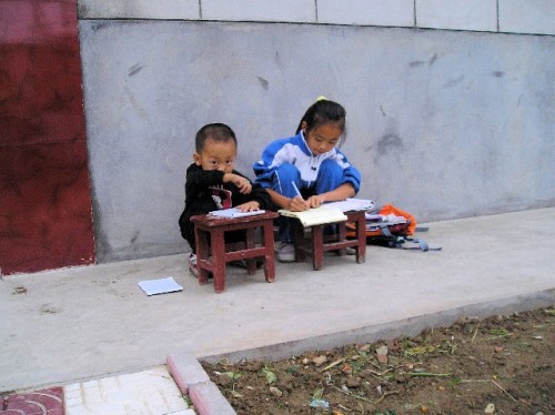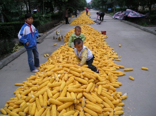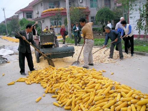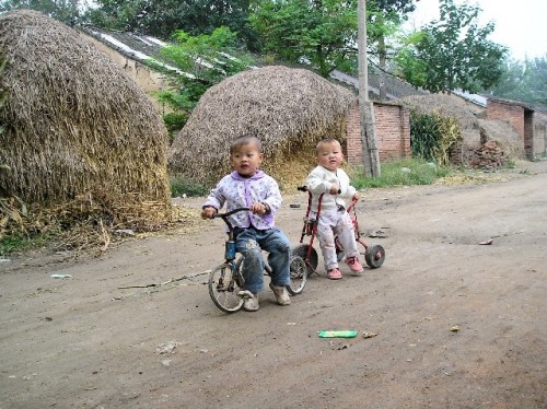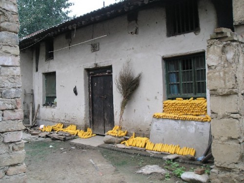 The view from the terrace showed that corn was the lifeblood of this village. Corn was on rooftops; it hung from windows and formed mounds in doorways. Our host's house was spacious but sparsely furnished. Three bedrooms upstairs, where we stayed shared one bathroom. The beds were hard but comfortable; flax seed pillows were an adjustment. Other furnishings of note were a TV, an electronic music keyboard and a loom. For supper we rolled beans, peanuts and cauliflower in edible rice paper, followed by noodles in broth. Afterwards we went dancing in the village square with women and children. Breakfast included congee (porridge) made of corn, flat bread with onion and vegetable filling, green beans, rice, noodles and corn fritters accompanied by green tea. Susan had advised us not to finish everything on our plate, as this would indicate that we had not had enough to eat. Assuring our hosts that we were full, we strolled to the west side of the village to get a taste of the old countryside. We came upon a few bikes on dirt roads and many dilapidated houses. The once ornate front doors with guardian kings and good fortune signs showed their age through strips of peeling paint and mossy patina. Men harvested corn, while little children played in pants with split bottoms for easy squatting.