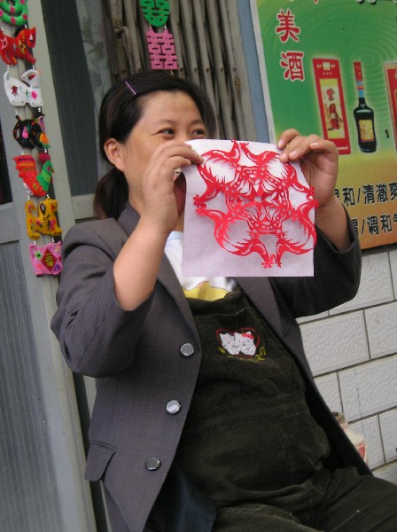 Hu Xian village is known for its farmers' paintings and for its folk art of paper cutting. Outdoor murals painted by the farmers adorn many of the buildings in the new village. We visited the studio of Pan Xiao ling, a renowned folk painter, who is also a leading force among the Peasant Artists. Her works are rich in color and depict scenes from the villagers' daily life and traditions. The one I purchased is of the Lantern Festival. At another studio we had a demonstration of paper cutting. By folding and cutting a square piece of red paper we were able to shape it into a symmetrical design. Those who learn this art at a young age acquire the dexterity required to create amazingly intricate forms out of fine paper or silk, which are sold throughout China. Loaded with these weightless treasures, we returned to Xian to catch our flight to Chengdu.
