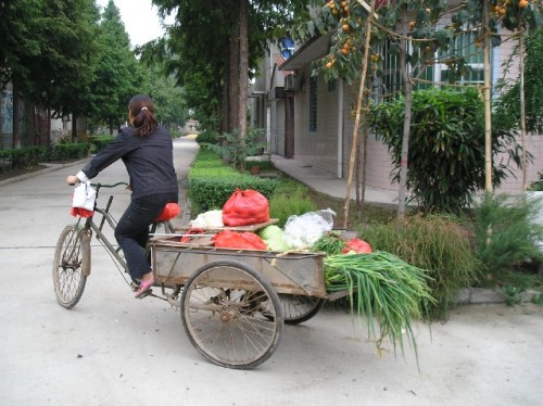On the return trip to Xian, the views from the window of women weeding by the roadside, overloaded trucks, hundreds of speeding bikes, traffic police and street sweepers in orange outfits in the haze, new apartments with penthouses and rooftop plants, a block-long Wal-Mart construction, statues honoring workers and a colossal statue of Chairman Mao on a pedestal greeting people summed up this city of 4 million.