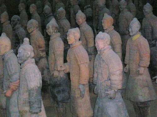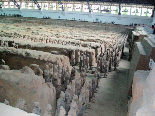 A farmer drilling to find water discovered the Terra-Cotta Army in 1974. Pits of 6,000-plus life-sized soldiers, ranked in military order by their color patterned armor, were uncovered in vaults at the entrance to the tomb of Qin Shi Huangdi, the first Qin emperor and unifier of China. We walked along the periphery of the excavations, which were roped off from the crowds. We were able to see the soldiers with unique facial expressions, modeled on live figures, buried for immortality. The farmer who made the discovery was on hand to autograph the book Qin's Terra-Cotta Army for us.