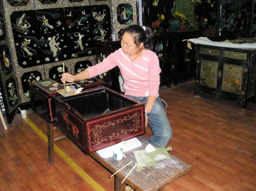 Lacquer ware is one of China's ancient arts. When we arrived at the local factory, we had to walk around the screen in front of the entrance that kept away bad luck and kept in good fortune. There is renewed interest in traditional Chinese furniture made of rosewood and lacquer. A piece of furniture takes fifty layers of lacquer with drying time in a dark room after the first twenty. Then it is hand painted and/or inlaid with mother-of-pearl. The showroom had exquisite pieces. I purchased small silk embroidery of the Yangtze River on silk cloth displayed between two pieces of glass and framed in rosewood.