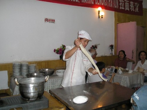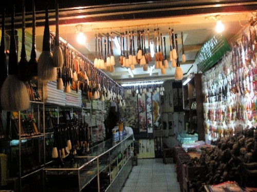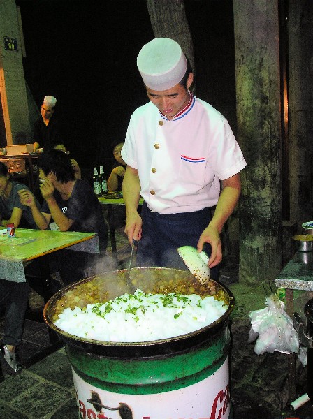 The evening's novelty was the visit to the Muslim market, which was lined with shops and stalls tended by vendors in white brimless hats. We stopped by a pharmacy that sold western medicine on the left side of the shop and Chinese on the right in little drawers filled with herbs. We sampled dried persimmons, roasted chestnuts, sweet cakes, sticky rice filled with bean paste, etc. The market was very crowded. Although Susan had cautioned us to be mindful of pickpockets, one person in our group fell victim to one. By the time she noticed that only the two strings of her bag were hanging from her neck, the culprit had disappeared into the crowd. We quickly exited the market.