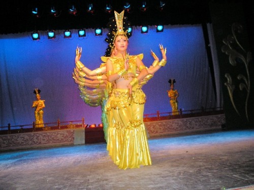 We sampled every imaginable kind of dumpling in different shapes and colors, including tomato with walnuts and peas. Billed as a Tang Dynasty Show the folkloric dances accompanied by live music were exuberant and colorful. They included the Ribbon Dance, the Terra-Cotta Soldiers' Dance and a Buddhist one called the Thousand Hands.