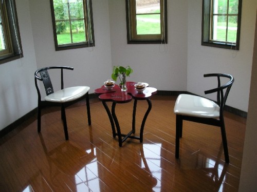 After seeing the old city wall dating from the Ming Dynasty, Susan surprised us with a visit to a model home complex in a recently developed area of Xian. A three-bedroom furnished unit we looked at was contemporary design at its best. It incorporated traditional motifs into today's aesthetics of simple clear lines. Bamboo grew in glass case room dividers; traditional flower arrangements graced the recessed walls. The bathroom floor was divided between wood slats around the sink and tiles around the bathtub. Similarly the sunroom was sectioned off with a floor of pebbles for houseplants and a wood floor for the sitting area. Soft versus hard, warm versus cold played throughout.