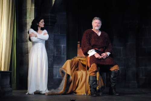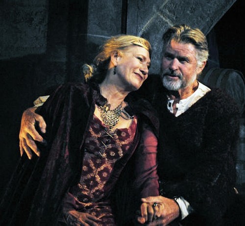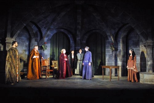 During the family holiday of 1183 Henry was still robust and randy at 50. We find him during the first act, in a truly magnificent Gothic castle designed by Brett J. Banakis, in bed with his mistress the teenaged Alais Capet (Tara Franklin). She was the sister of the young French king Philip Capet (Matthew Stucky) who is also there for the occasion. The maiden has been engaged in childhood to Richard and raised by Eleanor.