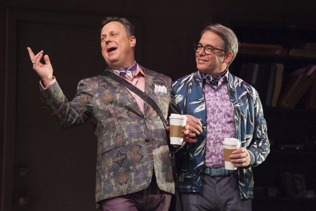 For complex reasons entailing strategy for not getting fired from his humdrum job, Wilde instructs the numbingly straight Martin O’Reilly (Matthew Broderick) how to simp and wimp. The proper gay way to walk is light in the colorful loafers with mincing steps as if over popping bubble wrap. It’s hilarious when O’Reilly actually tries that. Ashmanskas is a master of expression, movement and physical comedy.
