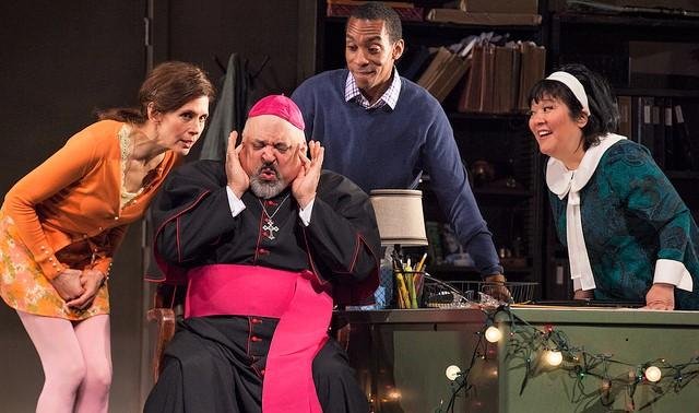 In a richly detailed set by Allen Moyer the action occurs over two days in as many acts in the Good Shepherd Catholic Supply Warehouse in Scranton, Pennsylvania. On shelves and table surfaces we view an inventory of accessories for Catholic smells and bells. With strident idolatry this is a setting that would have Martin Luther in fits.