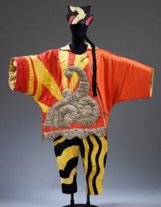 This white felt robe for the production’s ‘Mourner’ characters has appliqué geometric spots and chevrons, representing the markings of the Chinese deer, an animal that symbolises longevity in Chinese mythology. The graphic patterns of this costume converted the mourners into a spectacle of abstract shapes.