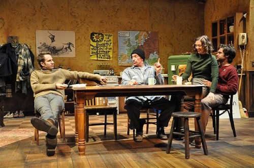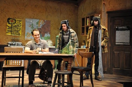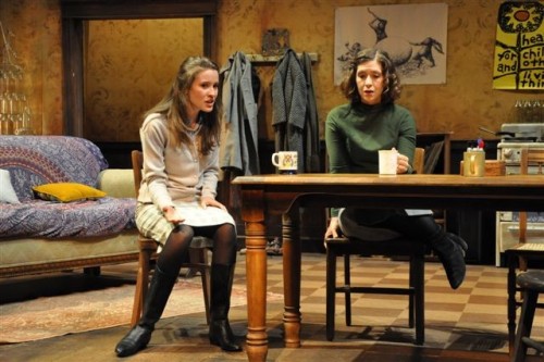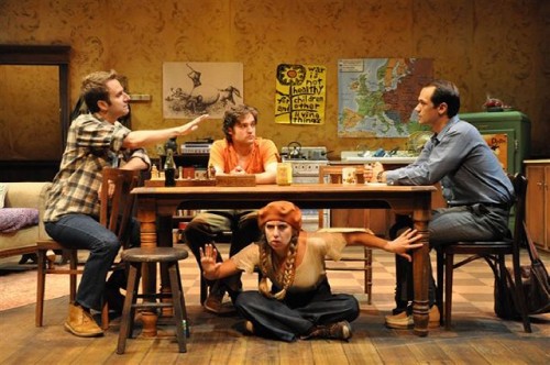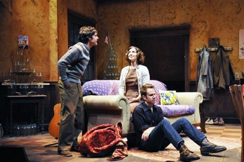 Many aspects of this production are spot on in capturing the cusp of the transformative tidal wave of rock culture, radical politics, and social movements from civil rights and feminism to gay rights. The set, that shabby, cheap, off campus apartment (designed by John Traub) was absolutely priceless from the crummy old refrigerator, painted a bilious green, to just the right posters on the walls. Even such details as the non descript clothes and hair length, fairly short and normal, (by George Veale) were perfect in nailing the ambivalent look and feel of 1965.