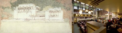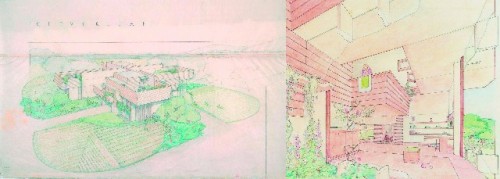 Interestingly, the original color that Wright wanted to use for the Guggenheim Museum exterior was to be a pink tone or a very soft red. This was eventually overruled by the Guggenheim family, but original drawings are included in the display. The much lamented Larkin Company Administration Building (1902-06) in Buffalo was wonderfully exhibited to demonstrate the quality of this now long ago torn down structure. The Oak Park, IL Unity Temple (1905-08) still resonates as a beautifully spatial house of worship. Strangely, the elegant but rather weird renderings for the never built Gordon Strong Automobile Objective and Planetarium for Sugarloaf Mountain, MD (1924-25) previews the structural thinking for the Guggenheim nearly a half century later.
