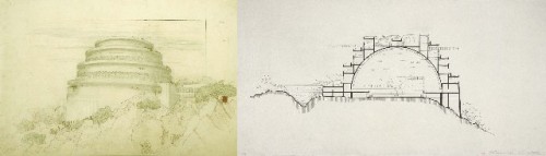 Of course, other famous Wright's structures were also included. Among these were the great but now demolished Imperial Hotel in Tokyo (1913-22), Taliesin West (1932-59), the unbuilt Mile High Office Tower for Chicago (1956) and the hexagonal Beth Sholom Synagogue in Elkins Park, PA (1956). Yet, what was most startling were s few of the literal clunkers in the show, specifically the monstrosity that was designed for Huntington Hartford in Los Angeles and the kitsch project for the Shah of Iran in Tehran. Both projects were thankfully unbuilt.