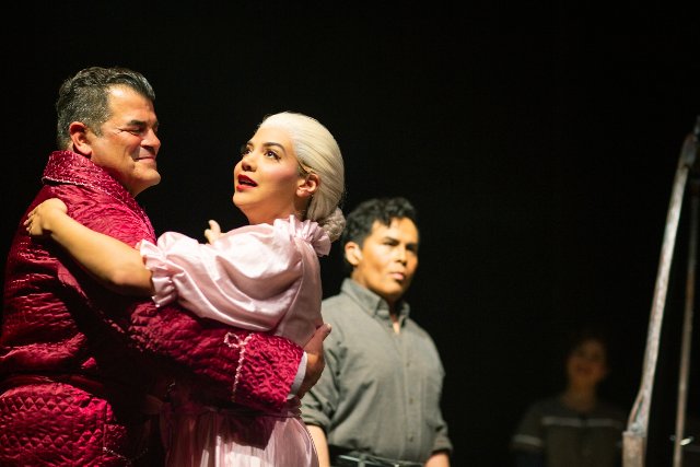 The production itself is quite striking. Set in a spare black box style with Heather Kenyon’s limited staging, low but active lighting by Michael Oesch plays a key role, and Abra Berman’s costumery offers visual impact and diversity. On the music side, Dave Dobrusky’s orchestra provides fine support for the singers from the dissonant opening “Requiem” by the chorus to the touching “Lament” by Eva at the end. Fine choreography by Nicole Helfer includes several sharply drawn tango pieces that are representative of Argentina.