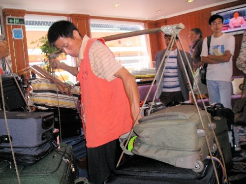 Back at the ship, the big hit of the buffet lunch was the fried onion rings, as we set sail through the eastern section of the Xiling Gorge to Yi Chang port for the next leg of our trip. The porters' carrying our heavy luggage is an image of our disembarkation that will stay with me for a long time. Suitcases stacked in threes, looped by a rope and suspended from a yoke on their shoulders, smallish porters had to climb steep stairs to get to the buses waiting for us.