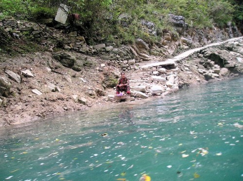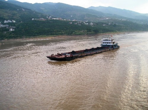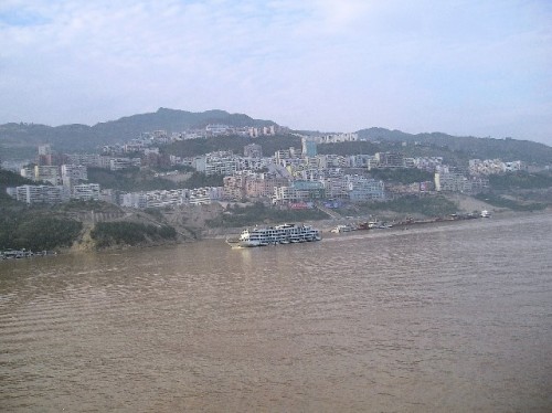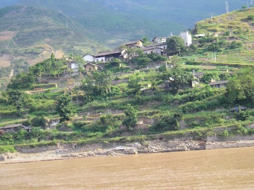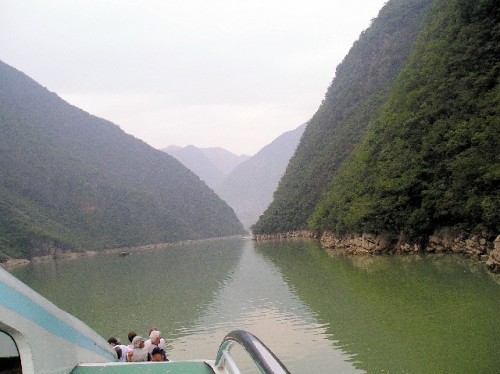 Continuing down the Yangtze we entered the Wu Gorge, the second of the three, its sharp peaks jutting into the haze. Free-flowing imaginations spotted a beautiful girl on top of the mountain. The river traffic was brisk: government cruise ships, ferry boats taking people between towns on the river, cargo barges and hydrofoil speed boats that cover long distances in a short time. Mournful horns greeted one another as ships billowed black smoke. In two years the water will rise to 175 meters, so everything below that level is being taken down to avoid hazardous navigation and river pollution.
