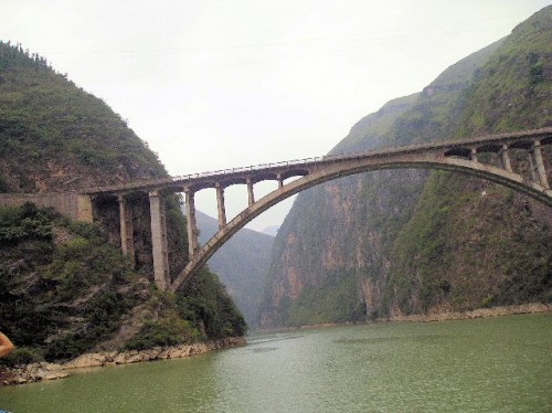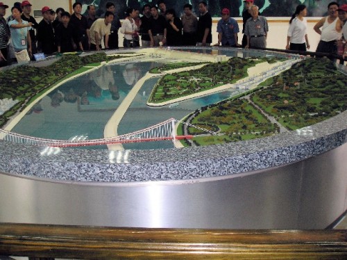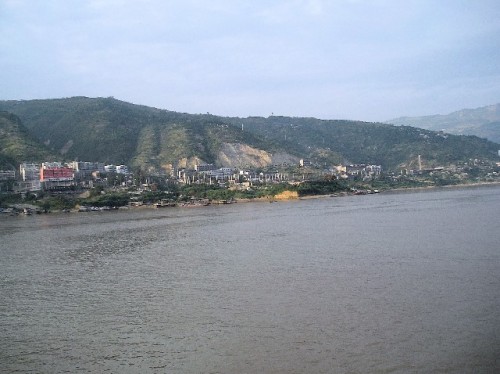 In the morning we visited the dam site, chosen on purpose near a granite quarry. To ensure the structure's strength, concrete is mixed with granite. Currently 17,000 Chinese are working on the dam day and night, down from 28,000 in its early stages. The dam will have 45 gates and 32 turbines, 13 of which are already working. Supervised by 2000 Chinese engineers, it is projected to cost 28 billion (US) dollars, including the relocation of people. In addition to controlling the area's severe flooding and harnessing much-needed hydroelectric potential, the dam will open up the Yangtze to 10,000-ton ships and the water collected will be used for irrigation.