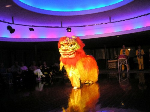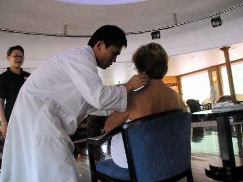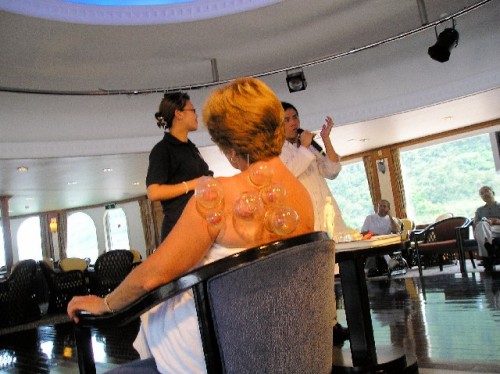 The three-day cruise was packed with opportunities to learn about cultural traditions. Dr. Hu made the first presentation on the 1000-years-old Chinese medicine, which emphasizes the whole body. The color of the face, tongue and palm indicates the balance of ying and yang. Treatment may be with 10,000 varieties of medicine or with alternatives such as acupuncture, acupressure, scraping and cupping, which is good for muscles and nerves. The body has fourteen main channels; the places, where they connect are the acupoints. Acupuncture needles stay in for fifteen minutes to open up blocked channels. He applied needles to a volunteer with stiff-arm and neck, and then cupped her back. The problem area swelled up and turned dark purple with the suction of the heated cup. He proceeded to show us the various pressure points for treating motion sickness, insomnia, stomach and toothaches.