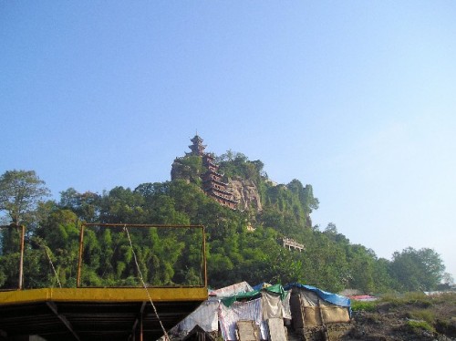 The Victoria Star set sail at 9 p.m. with 160 passengers. Old homes along the riverbank and apartment blocks set back on the hillside created a picturesque nightscape. These hills had been hideouts for soldiers during World War II as China fought against Japan; Chiang Kai-shek's Nationalist government, centered here, ended when he left for Taiwan in 1949. In the morning the ship docked at the famous Red Pagoda of Shibaozhai. The 12-story structure, built without any nails, rests against a massive rock behind it. The road to it is lined with stalls of local crafts. I bought a T-shirt splashed with bamboo images, accompanied by a poem in Chinese characters that read "No matter from which direction the wind blows, the bamboo will spread its young shoots".