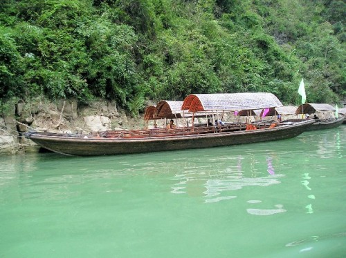 The next shore excursion took us to Wushan. We boarded a motorized boat down the Daning River through the scenery of the Lesser Three Gorges, spotting little monkeys and admiring the green waters of the Emerald Gorge. We then transferred to sampans to enjoy the shores of the Madu River. The sampan captain shared his straw fisherman's hat and goat hair cape for photo ops, as he threaded the boat through narrow passageways by steep rock walls. We passed by precipices, wooden coffins tucked into ledges by the ancient Ba people, high water marks, deep valleys, a lagoon where a villager sang as she did her laundry, a peddler's market, sweet potato crops and ducks.