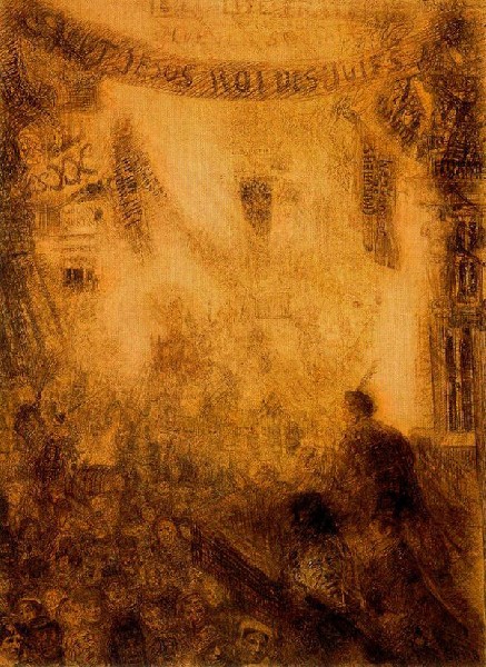 Throughout MoMA's exhibition, themes overlap as Ensor explores a wide range of subjects. First there are the city scenes and the landscapes. Then religious paintings he had created from the mid to late 1880's. The most famous of these Christ's Entry into Brussels (1989) hangs in the J. Paul Getty Museum and wasn't included in the show. For whatever reason it didn't make the trip cross-country. However, there is a very large drawing of Christ's entry into Jerusalem created four years prior to the Brussels piece.