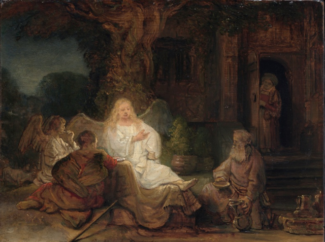 A small painting at the end of the gallery hall, entering the exhibit, shows Abraham entertaining travelers as a shadowy Sarah is tucked into a doorway behind him. Here Rembrandt, unlike any other artist who has depicted this scene, shows the travelers as angels, transitioning from human-like to the radiance of the holy. The traveler nearest Abraham has his wings tucked behind his back. Next to him, is a traveler in transition, his wings unfolding, but still human enough to eat food. Then there is an angel in full glory, whose light is cast across the entire painting. The annunciation of Isaac's impending birth is to be told to Sarah and Abraham.