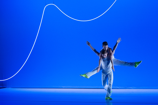 The piece derives its name from a large curving tube of light. One wants to say neon but perhaps some other technology given its ability to quickly change bright, luminous colors. The back wall also constantly morphed with pastel colors designed by Nicole Pearce with Lang credited as set designer.