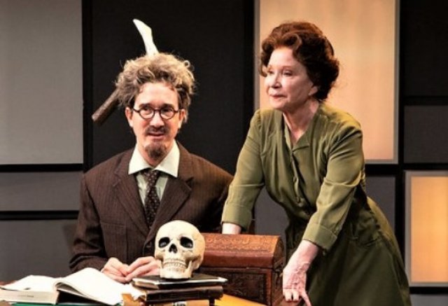 The final segment of the first act Variations on the Death of Trotsky hinges on riffs of a sight gag. The Russian revolutionary, on the lam in Mexico, was assassinated while a guest of the Marxist artists Diego Rivera and Frida Kahlo. From behind an ice pick or ax was smashed into his head. Here we see Leon with a mountain climber’s pick embedded in his scull. These final moments are shared with Mrs. Trotsky (Rupp). We meet the Spanish gardener who did the nasty deed. The head prop is milked for maximum impact.