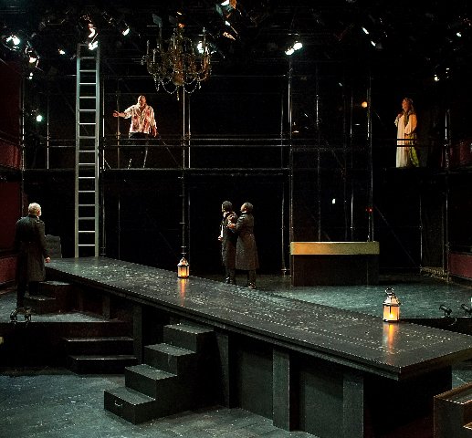 There were aspects of the production that were innovative and successful. The design of Cristina Todesco created possibilities of unusual sight lines and levels. There was a long platform with embedded spotlights that served as runway and banquet table. It was set as a thrust angle creating off-kilter vectors. That prompted engaging staging including full use of the aisles.