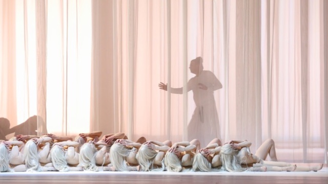 Choreographer Cindy Van Acker not only gives us the drawing of the bow in sync, but also bodies in a wave. While what happens at a baseball stadium when a cheering crowd rises and moves around the ballpark has never seemed particularly erotic, Van Acker’s figures are as they swoosh from collapse to arousal to collapse.