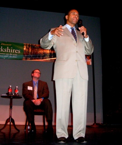 On Friday morning the first term Democrat, Governor of Massachusetts, Deval Patrick, spread his recent campaign mantra of "Together We Can" to the arts and cultural community of the Berkshires. He was introduced by Julianne Boyd who hosted the meeting and greeted invited guests in her now fully renovated Barrington Stage Company in a former vaudeville house in rapidly changing downtown Pittsfield.